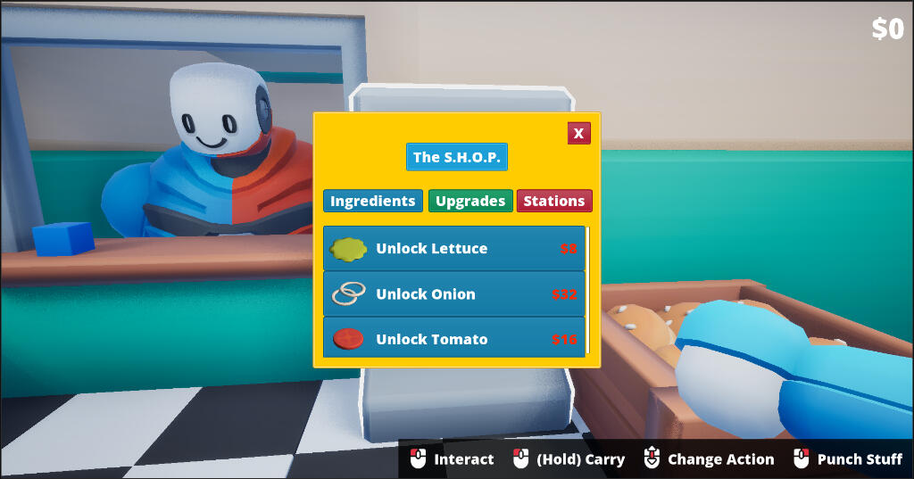 Players assume the role of a robot that can only punch and chop things and can assemble burger orders for hungry customers. Assemble ingredients in the correct order to make money and upgrade the restaurant.Role: Lead Designer and Developer